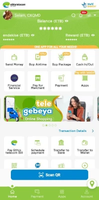 Ethio telecom telebirr SuperApp – tai viskas viename mobilioji programėlė, leidžianti pasiekti platų paslaugų spektrą vienoje vietoje. Atlikite telebirr operacijas, pirkite telekomunikacijų produktus, mokėkite už prekes ir paslaugas, naudokitės skaitmeninėmis finansinėmis ir vyriausybės paslaugomis kasdienėje veikloje.