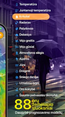 Gaukite itin tikslią orų prognozę ir vizualizuokite ją su unikaliu 3D žemėlapiu. Stebėkite kritulių, vėjo, debesuotumo raidą visame pasaulyje, matykite jų kilmę. Išsamūs meteorologiniai duomenys įvairiems aukščiams, be jokių skelbimų.